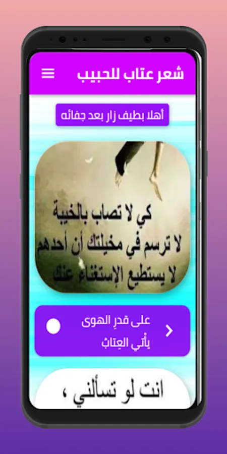 For every person interested in Arabic poetry, especially these types of poems, this application is suitable for you, as it provides you with extensive information about a great deal if you are interested in the subject of poetic poems about love, admonition and abandonment of the beloved
