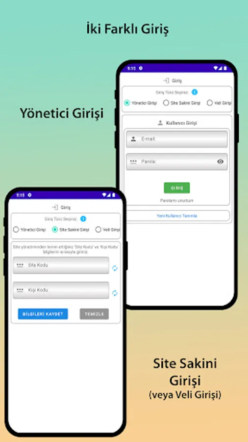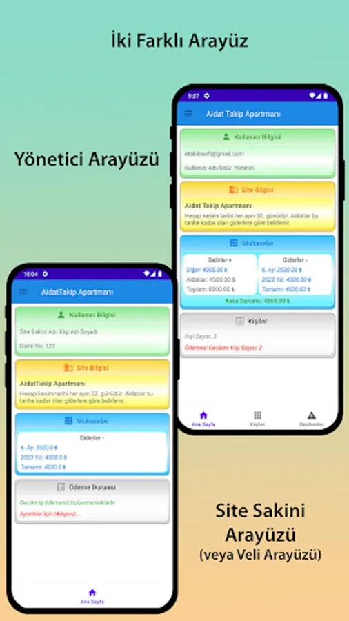 1. Site/Apartment or paid school administrators can easily follow-up their dues and income/expenses with multi-user support by 'Administrator Login'. Thanks to multi-user support, more than one administrator can use the application with different user roles (Administrator and other users) by logging in with the same user name and password.
