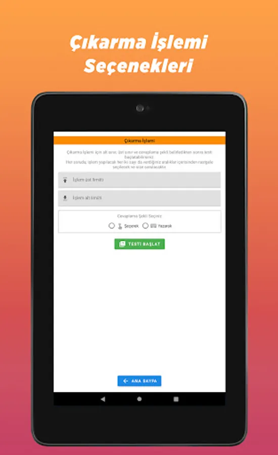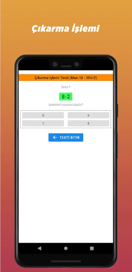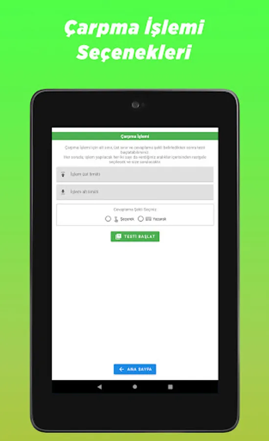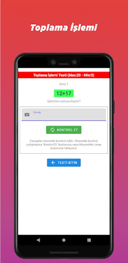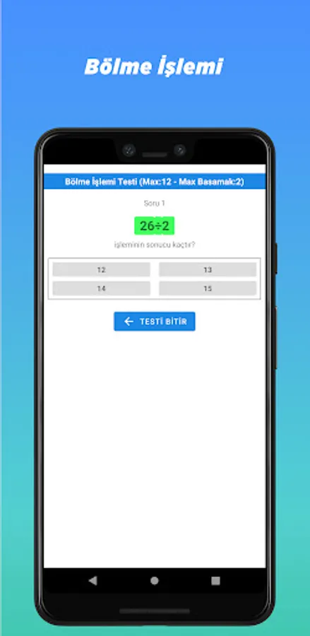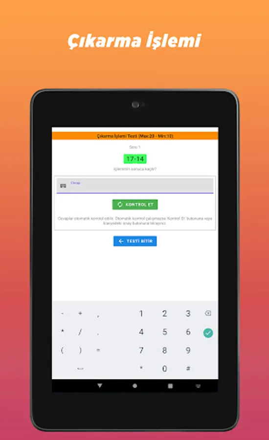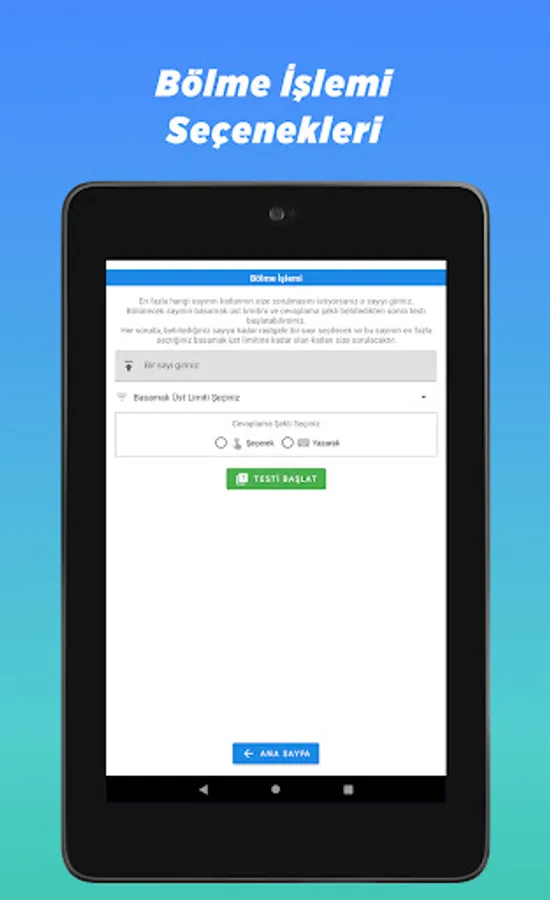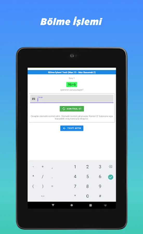You can test yourself about 4 operation (Addition, subtraction, multiplication and division) . You can specify upper limit and lower limit for all operations.
