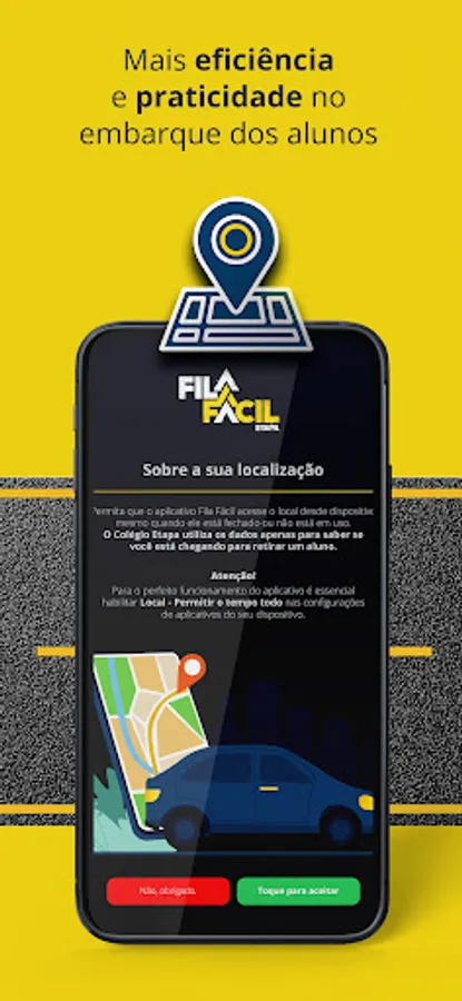 The FilaFácil application collects location data to activate the function to enter the student pickup queue when you are close to the school, even when it is closed or not in use.