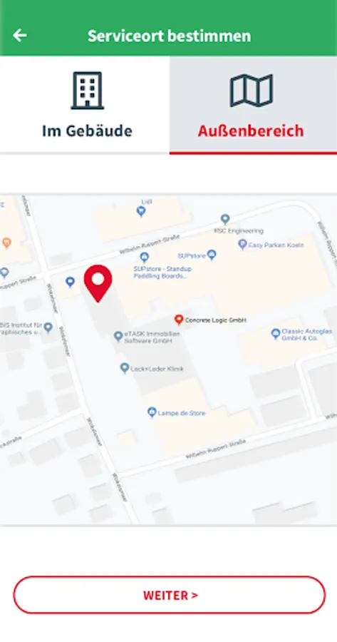 Select the service location directly (Building -> Room -> Workplace) or scan the (room) barcode directly with your device