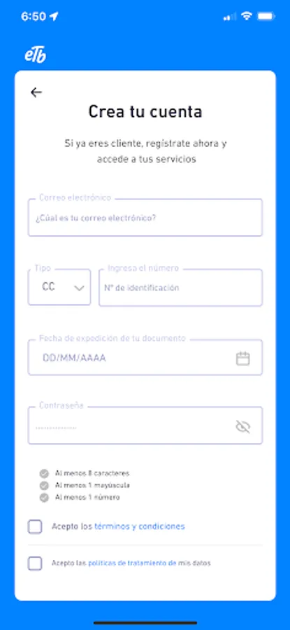 Enter with your username and password that you already have created in My ETB, or you can register if you do not already have it directly in your My ETB app. If you don't remember your login data to My ETB, you can remember your password using the option "Forgot your password?" in your My ETB app.