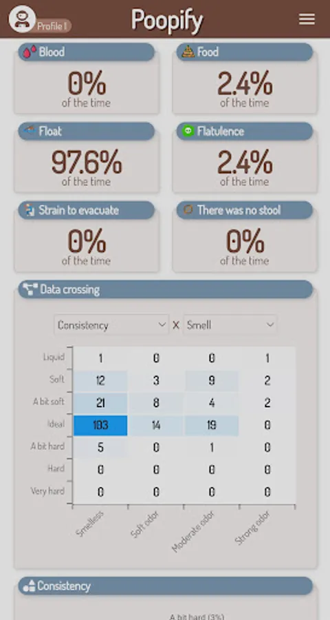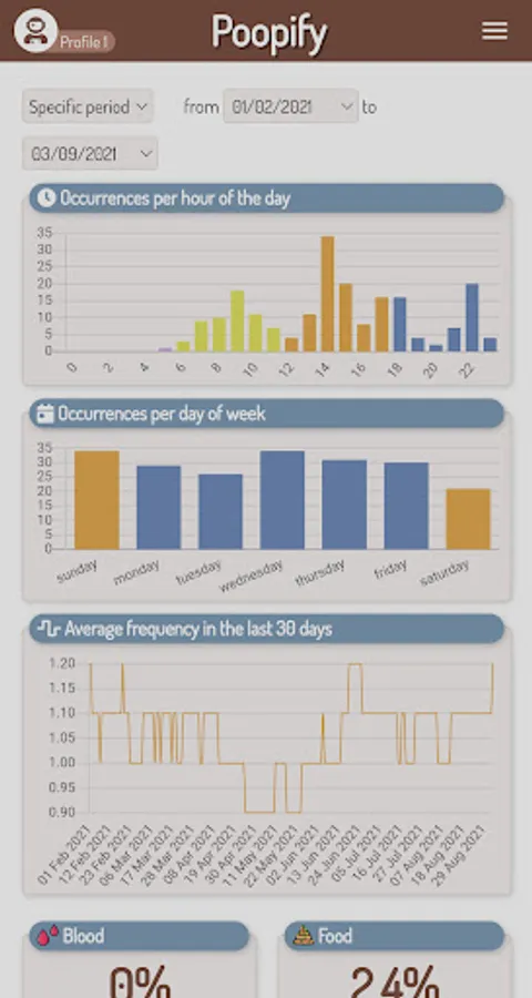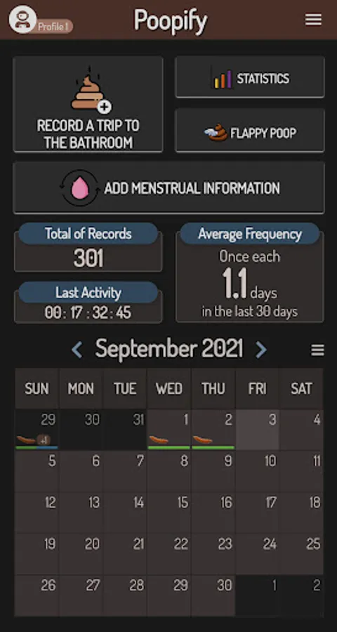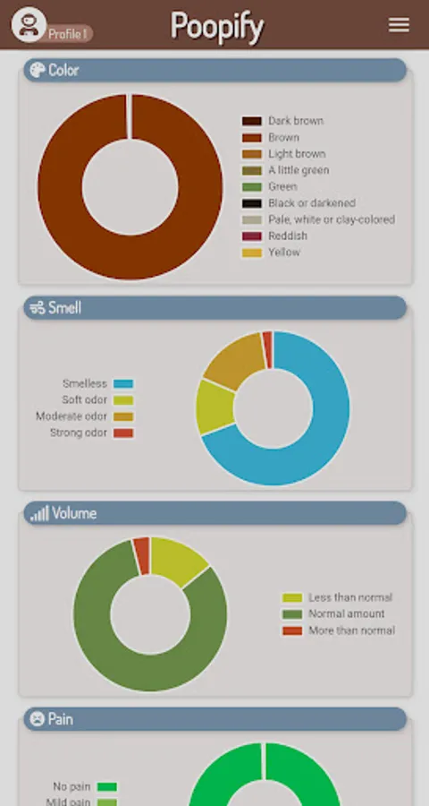 It also shows a lot of statistics and charts about how frequently you take a poop, when it occurs and which are your patterns. You can use this features to log your routine and show it to your doctor in case you have any health conditions.