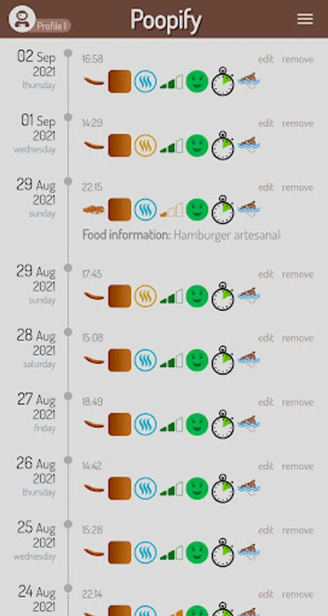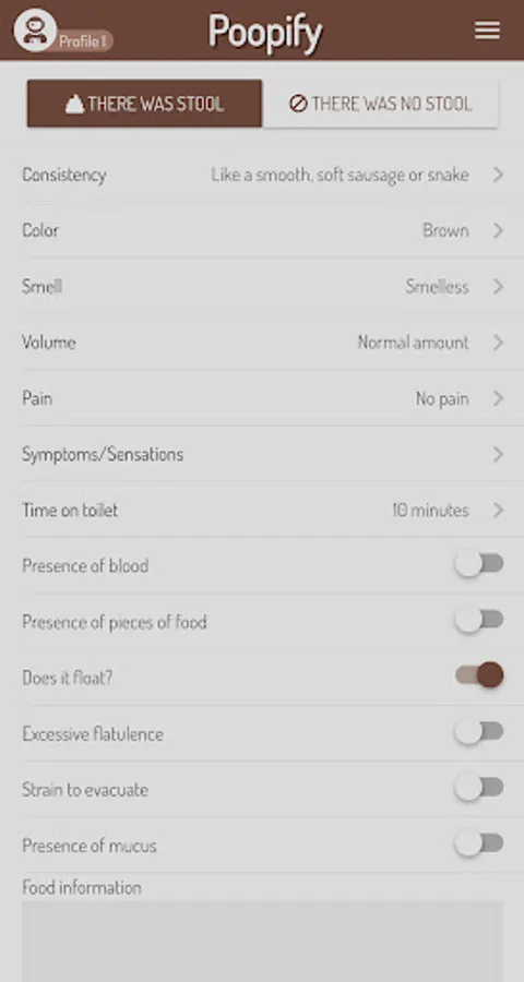 Poopify allows you to register each trip you take to the bathroom with details such as format, shape, color, smell, volume, pain level, time spent on toilet, presence of blood and pieces of food, whether it floats or not, if there was excessive flatulence, strain to evacuate, presence of mucus and write notes about it. You can also register symptoms and sensations that you feel before or during the activity. It is based on Bristol Stool Scale, a diagnostic medical tool designed to classify the form of human faeces into seven categories.
