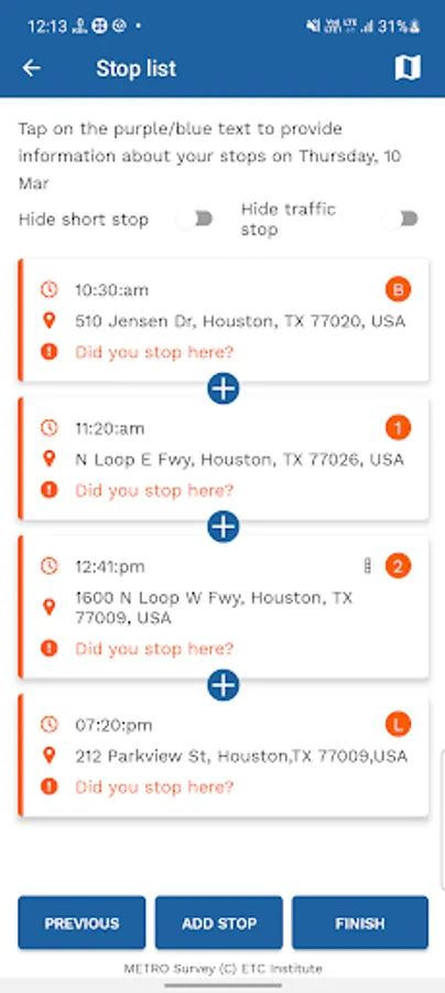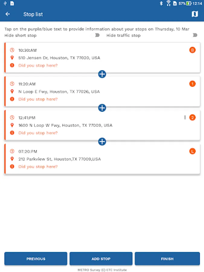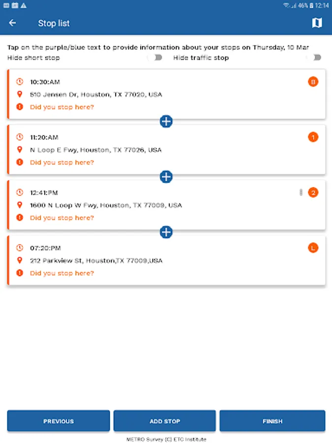The Houston Galveston Area Council HGAC / METRO Travel Survey app was developed using the latest stop recording techniques to help survey respondents easily record their trips while minimizing battery drain whenever possible.