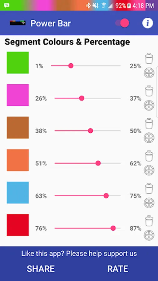 As many customizable percentages as you'd like that you can associate with any color you like so you can easily see how your charge is doing with one quick glance!