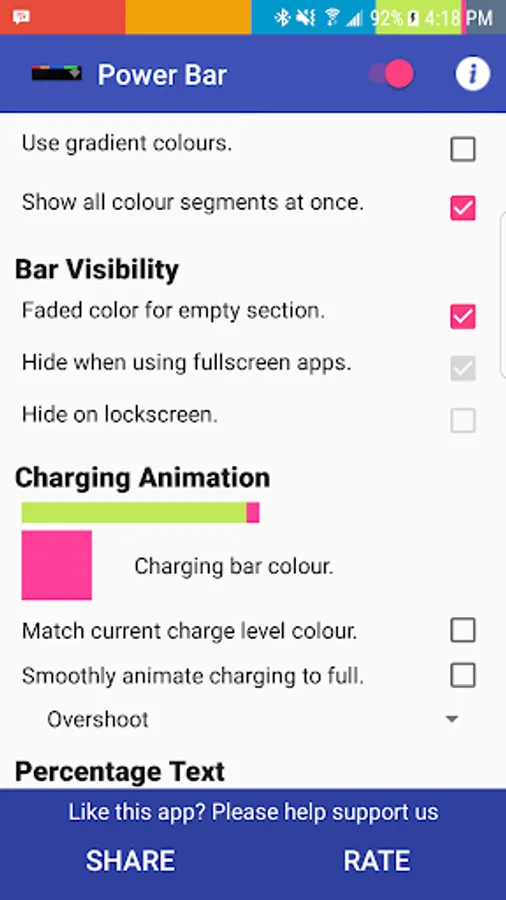 Many different options including the thickness of the bar, the colors and brightness/alpha of the bar, different animations that can play when your phone is plugged in and charging, also able to automatically hide the bar when using full screen apps!