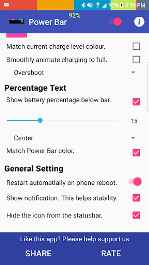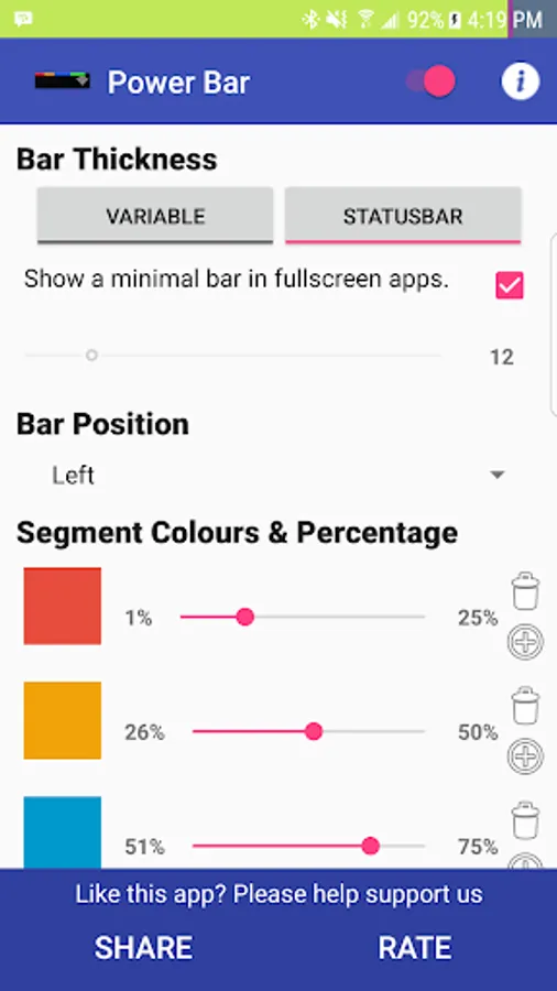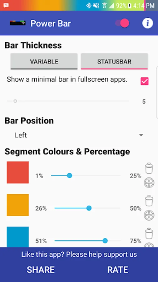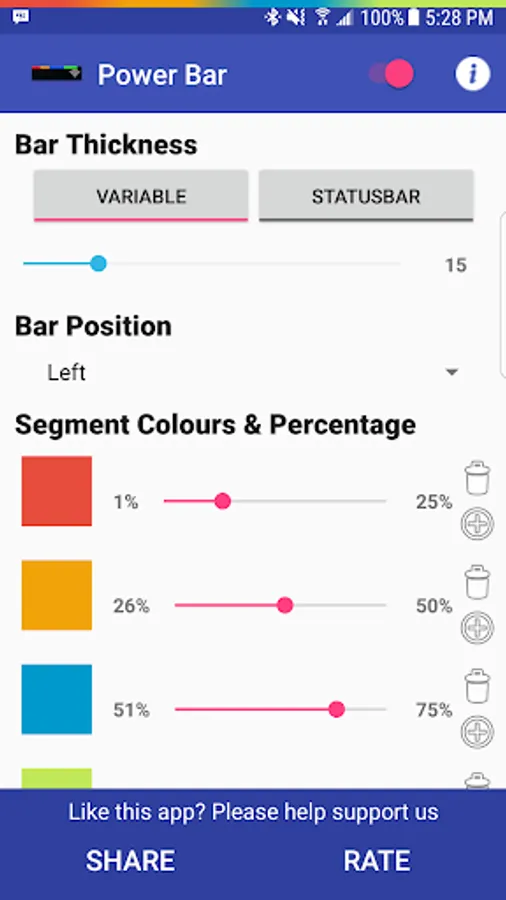 Power Bar is a FREE easy to use and customizable battery indicator that is always visible at the top of your screen! Stop worrying about the exact percentage your phones charge is at, with Power Bar you know your status with one click glance!