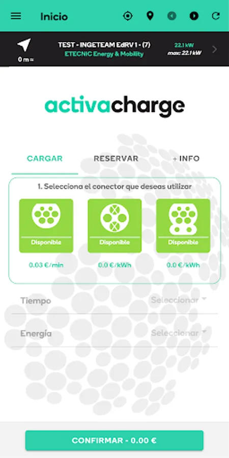 EV Charge shows the location, information and status of the different chargers, allows the customer to activate them and initiate a charge, graphically showing the process in real time.