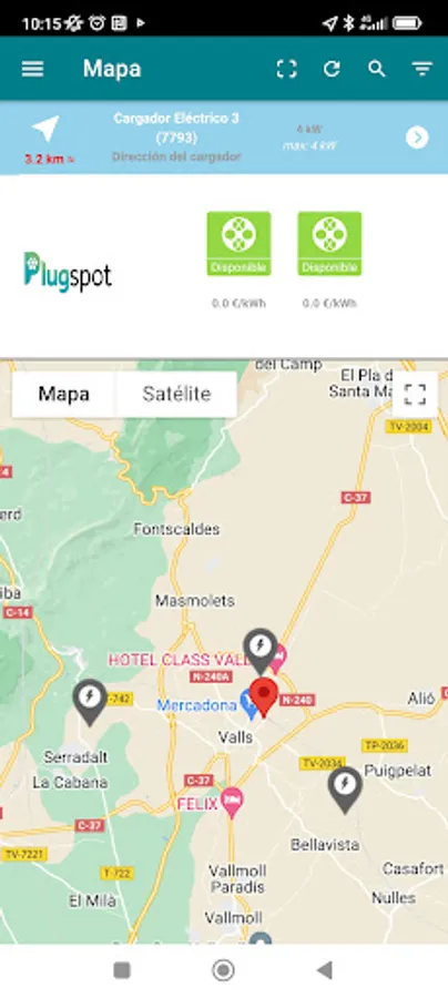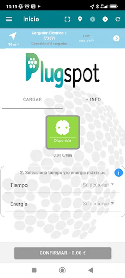 Plugspot shows the location, information and status of the different chargers, allows the customer to activate them and start a charge, graphically showing the process in real time.