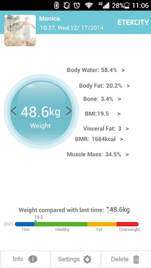 Etekfit is a great app to help record key body statistics. Automatically, all your data will be seamlessly recorded within the application. Share your data to social media platforms, such as Facebook, Twiter, Sina Weibo, Email and Message. Just enter your weight, Etekfit will do the rest!