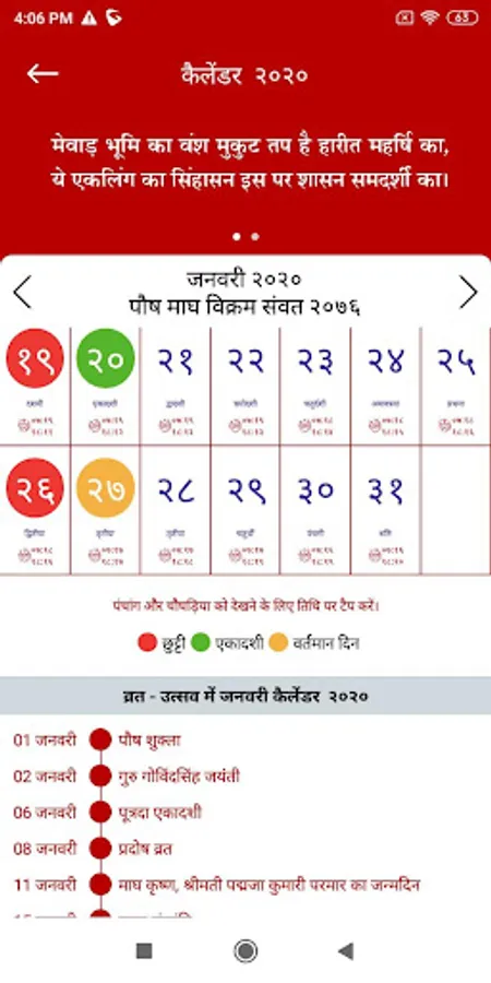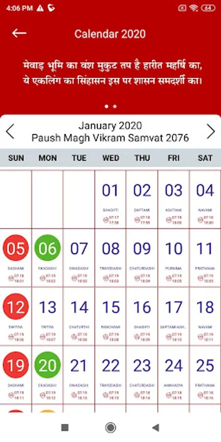 The Palace Calendar is an application to view Day wise Choghadiya and Panchang for any day of the calendar. Also shows varsh (Year), maah (month purnima and amavasya), zodiac of moon, along with their end times.