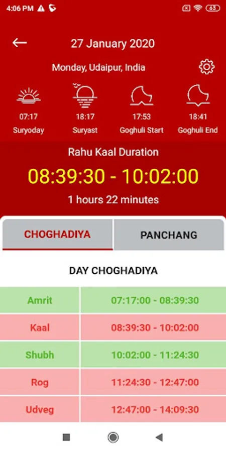 Detailed panchang view showing the sunrise and sunset for the chosen location. Day and Night Choghadiya, Rahu Duration and Others. All calculated for your chosen location.