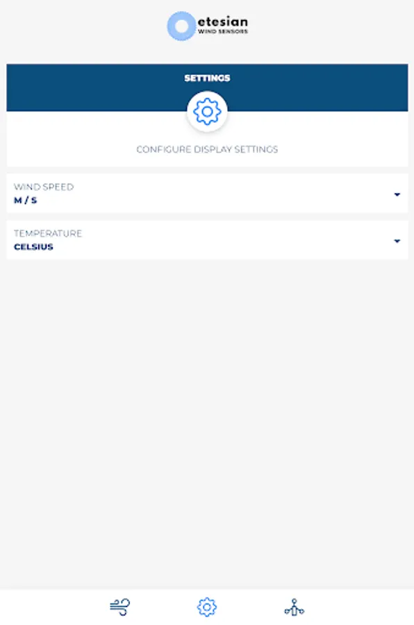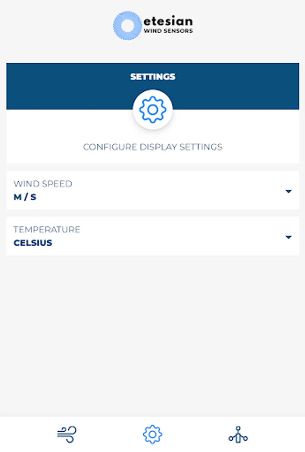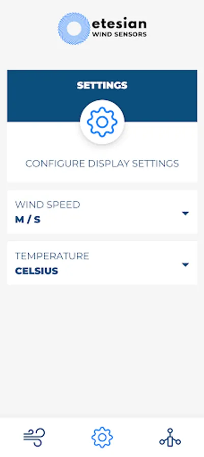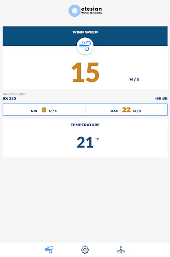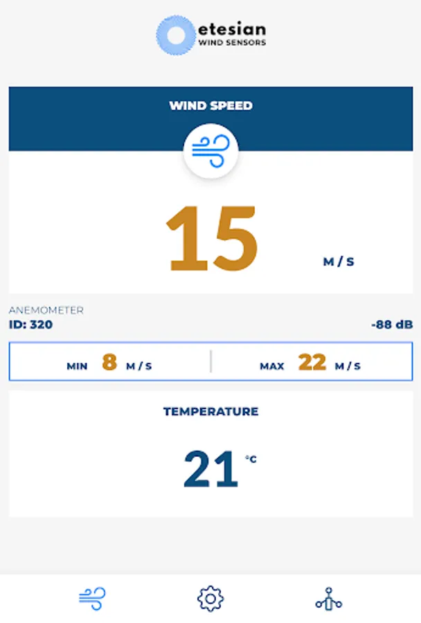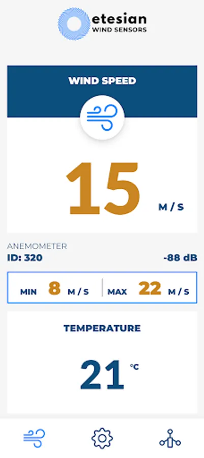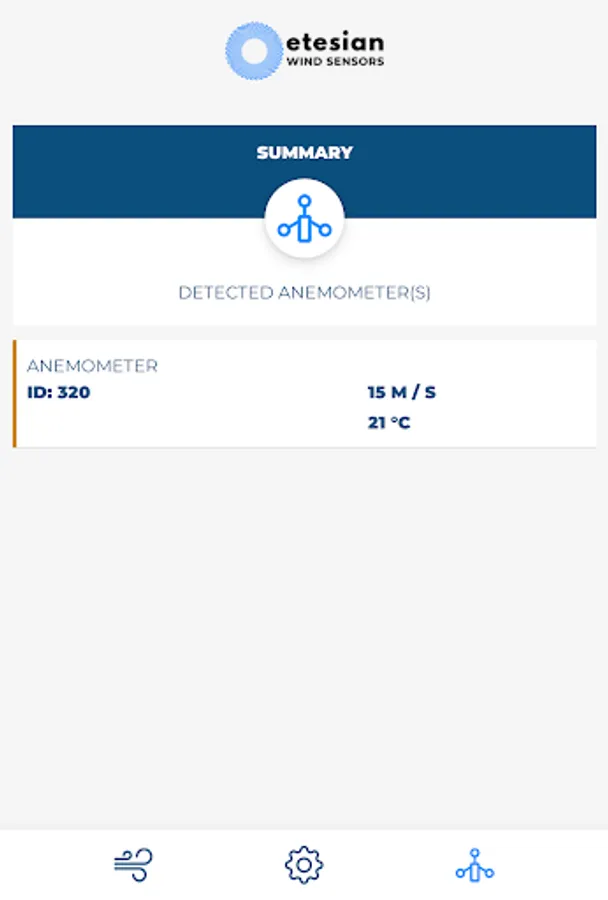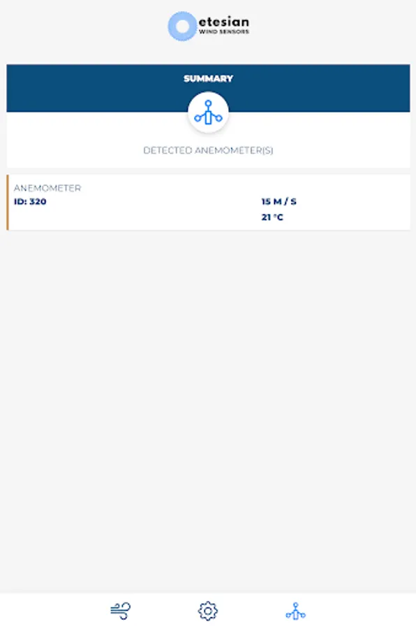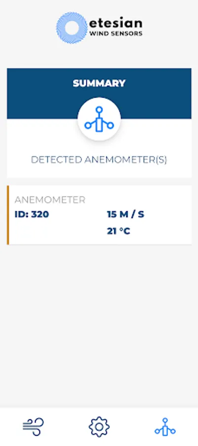 The Etesian Wind app receives and displays the wind speed from any Etesian Bluetooth LE anemometer that is within transmission range from a self-powered wireless anemometer. The app searches for any broadcasting anemometer signal and provides the user with the option to select one of the sensors for display on the main page. All of the detected anemometers wind speed and temperature transmissions can be viewed on a separate summary page.