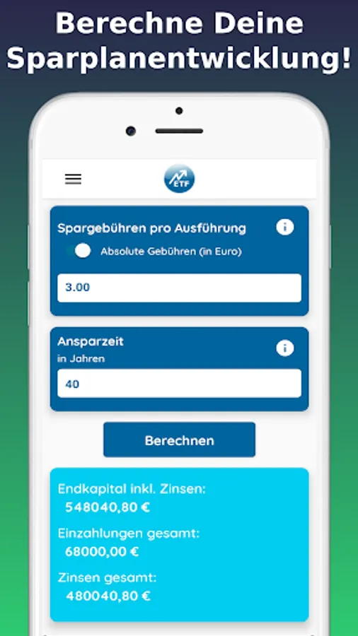 The ETF Savings Plan Calculator & Interest Calculator will help you to calculate the exact development of your personal ETF savings plan. Just set the sizes of your personal savings plan and see the development of your ETF capital!