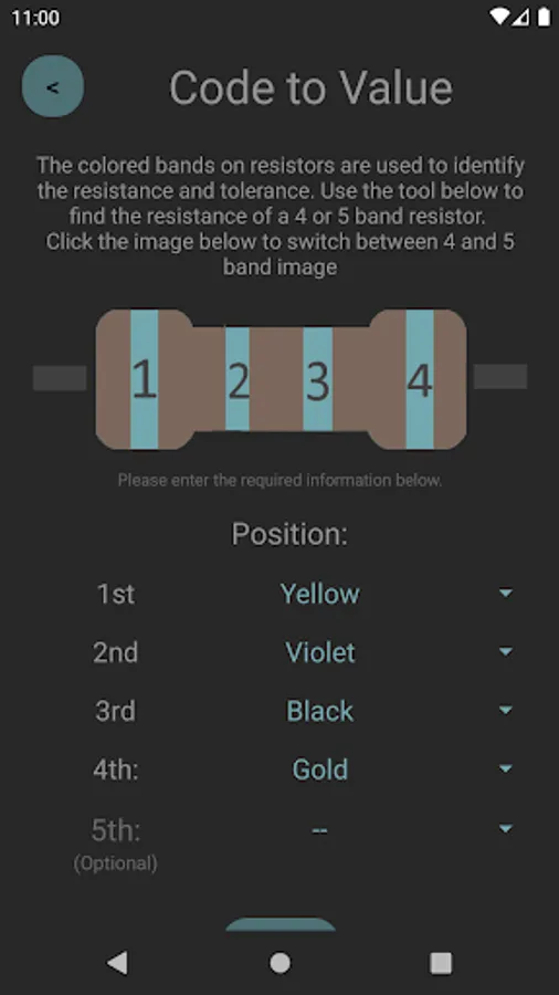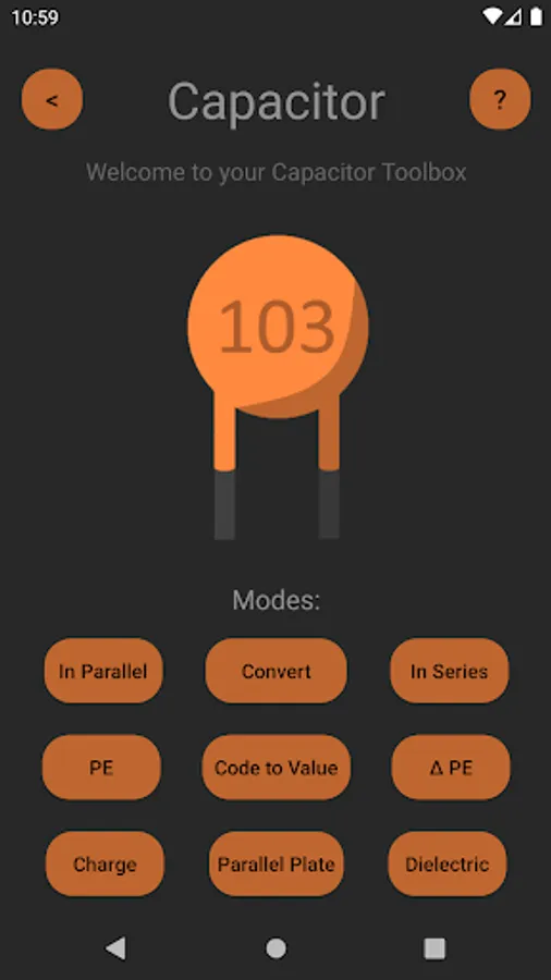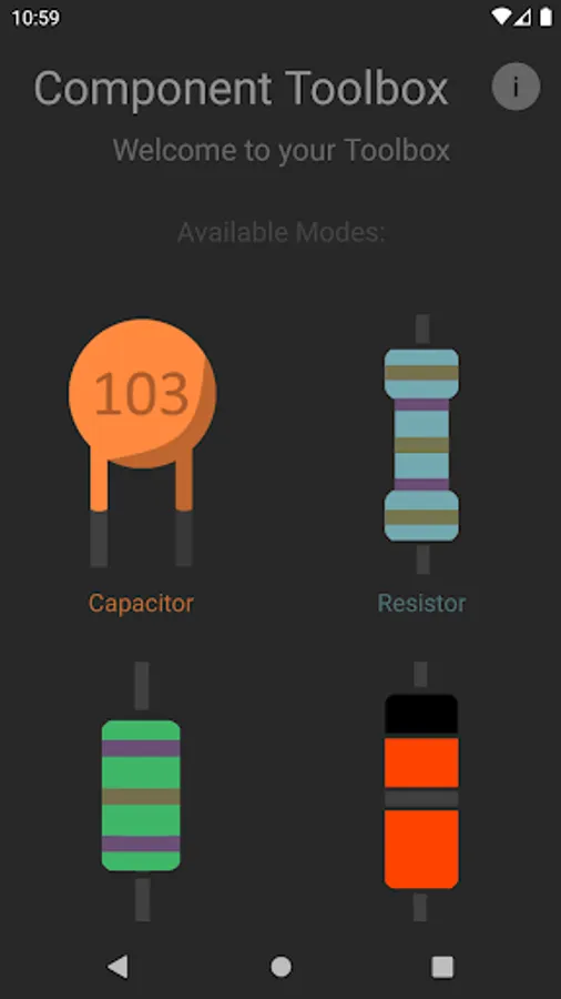 Use the most simple and straightforward, yet informational, app on the Google Play Store. Easily switch between our 5 modes: Resistors, Capacitors, Diodes, Inductors, and Transistors. Our sleek user interface with material design saves you the eyesore of other outdated, less modern styled apps. Not to mention, it's 100% FREE! And requires no permissions, keeping your data to yourself.