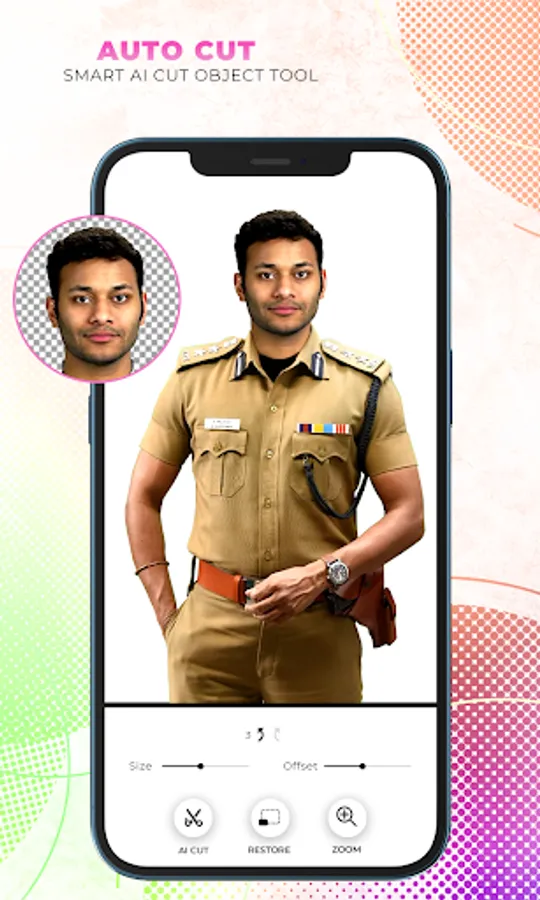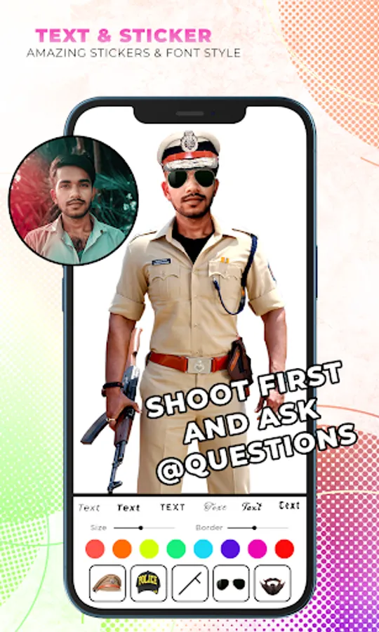 App contains many indian movie superstar (south and bollywood star) in police dress so you can set your face on these police dress and see yourself.