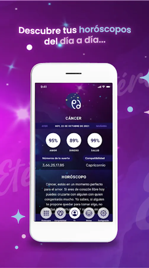 With Etérea, you will feel the future even closer and the stars will always be on your side. You will get accurate and detailed astrological predictions of all zodiac signs for today, tomorrow, every day of the week, every month for free. So enjoy your horoscope today, weekly, monthly!