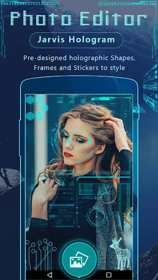 Jarvis Effect Photo Editor allows you to add holographic stickers easily to create a high-tech Head Up Display look, or to create a stylish futuristic photo.