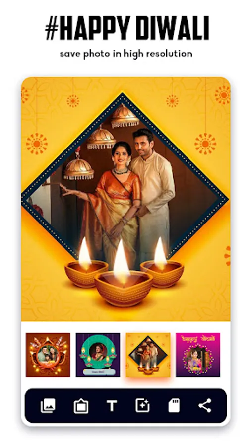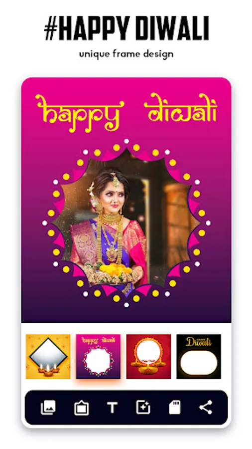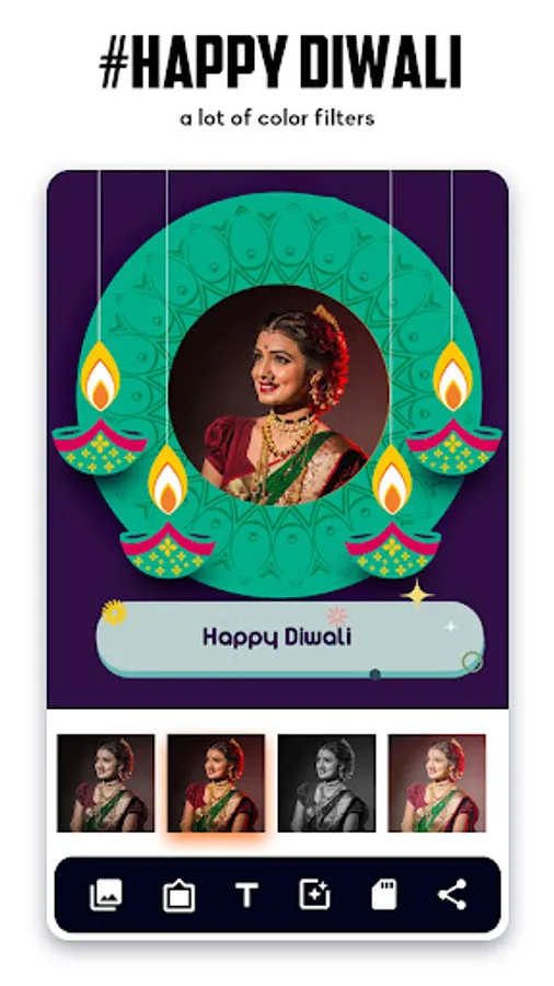Choose an image from the camera or gallery, and apply the Diwali frame you like to your picture.