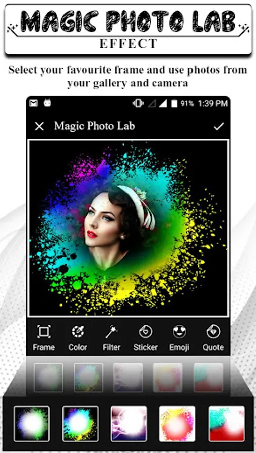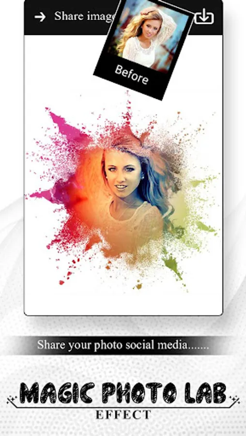 Magic Photo Lab Effects :Make brilliant pixel scattering impact pictures OR Create shining Glitter impact pictures and offer them via web-based networking media specifically from the application.
