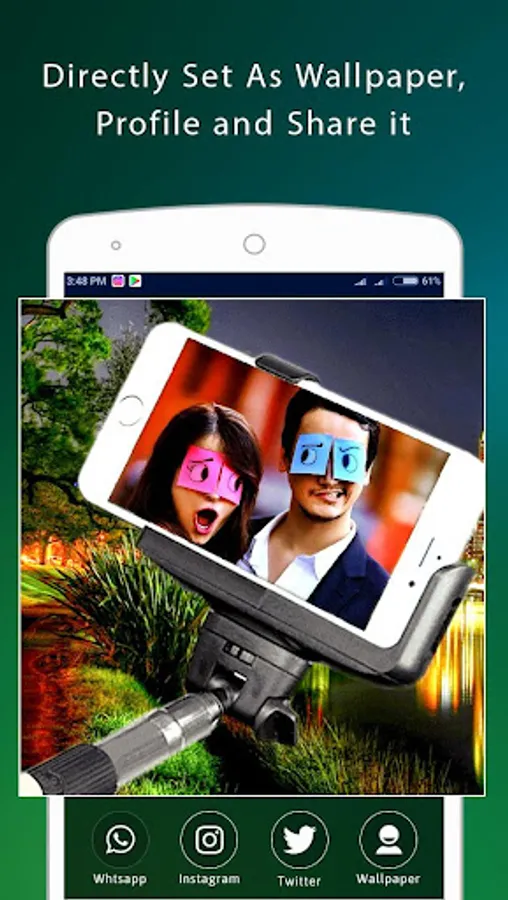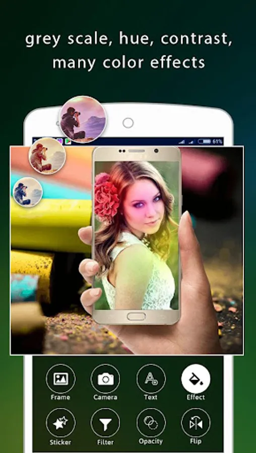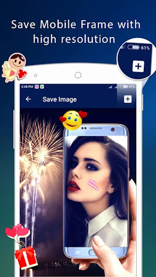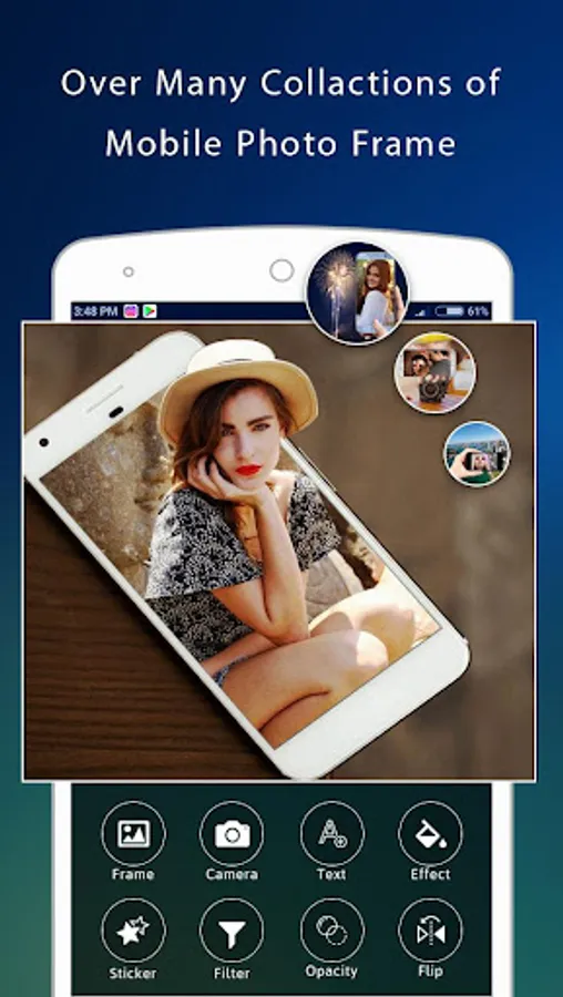 This is a mobile photo frame app there you have option to place your photo in mobile of your choice from the list of mobile photo frame provided in this app