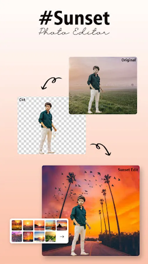 Sunset photo editor - background changer used for cut-paste photographs with changing background of sunset images.