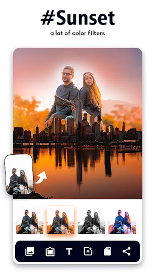 The Sunset photo editor app lets you set a unique background in your photo. This photo editor is a free application, very straightforward to make use of it. Utilizing this photo editor creates a picture more trendy with some creative text and stickers. This photo editor makes your sweet memorable memories captured in your image using a filter, trendy font, and the newest frames.