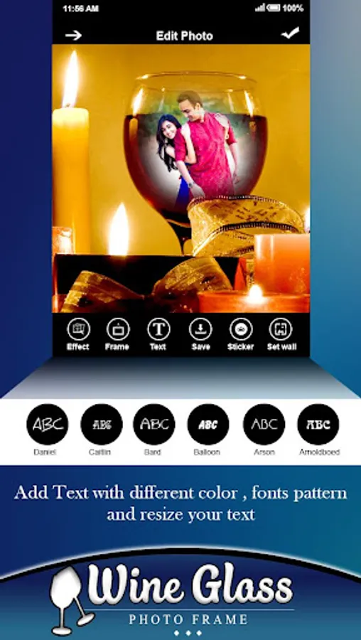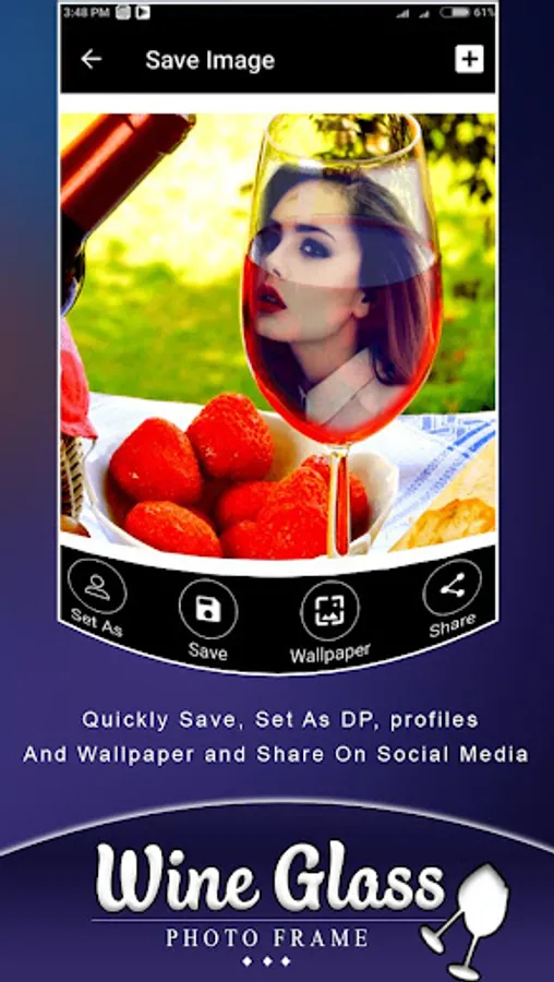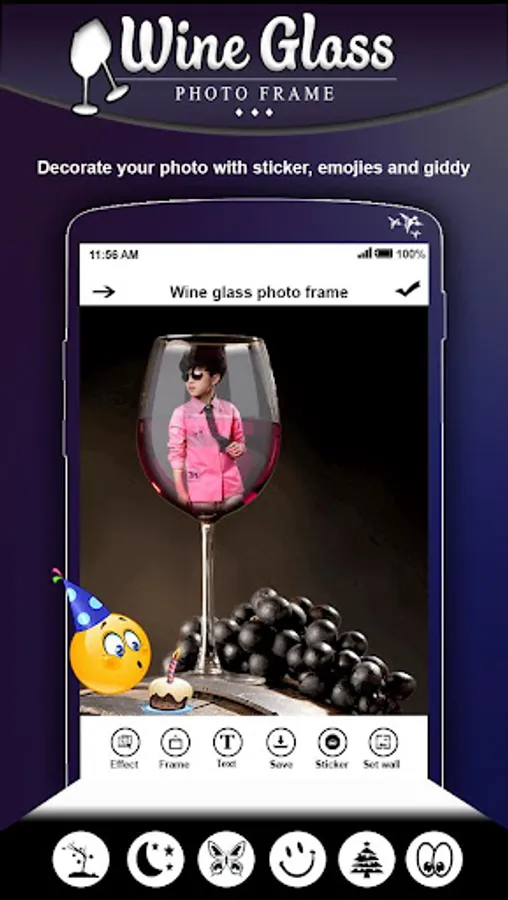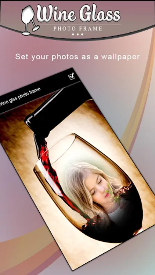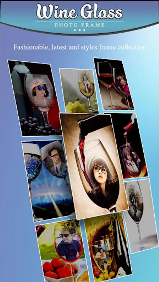 Wine Glass Frame This app make your Wine Glass photo look fantastic and more beautiful, lots of nice frame type like flower , beautiful scene , lovely frames make photo more gorgeous. Make an adorable photo so easily and let you have some fun activity with your friends.