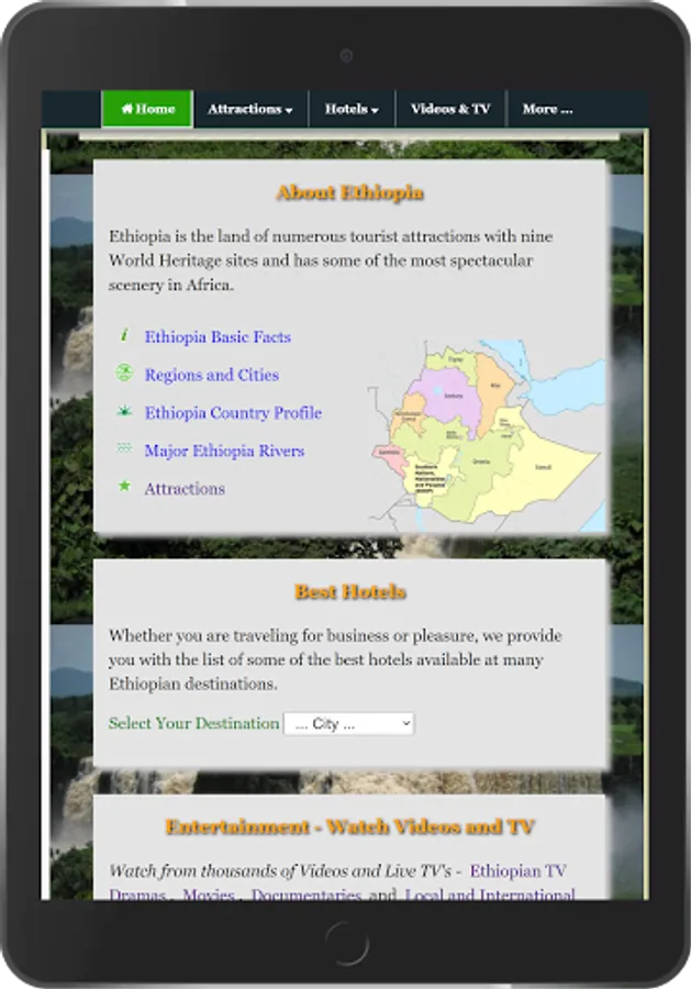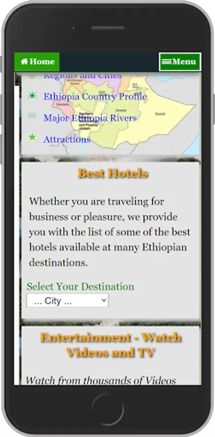 Welcome to EthioVisit.com App! The premier site for Ethiopia travel, attractions, hotels, businesses, entertainment videos, and more. Whether you are traveling for business or pleasure, we provide you with the list of some of the best available hotels at many Ethiopian destinations. Use the business directory to search from the thousands of local businesses.