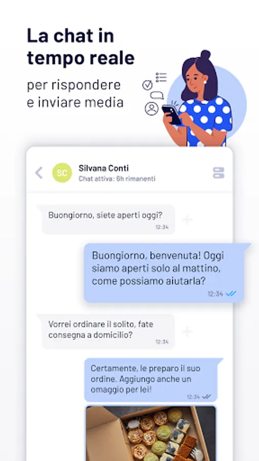 - Publish the link "Click to chat" of WhatsApp on your site and on social channels to immediately start talking with your customers. Insert the QR Code on business cards, catalogs, flyers.