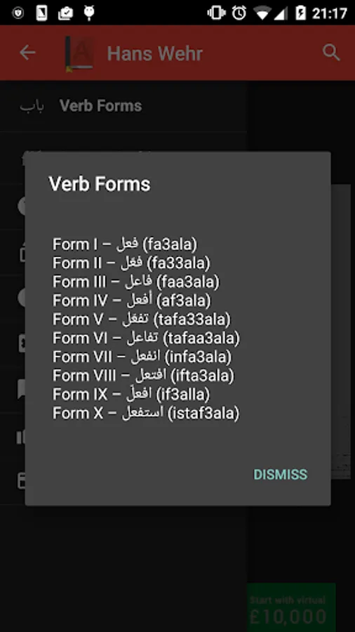 The Hans Wehr app is a digital version of the famous Arabic-English Hans Wehr dictionary. You can search through the dictionary by using the root letter of the word and the app will display the corresponding page from the Hans Wehr dictionary.