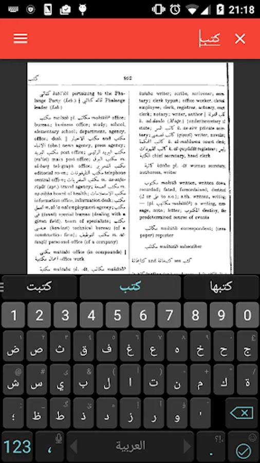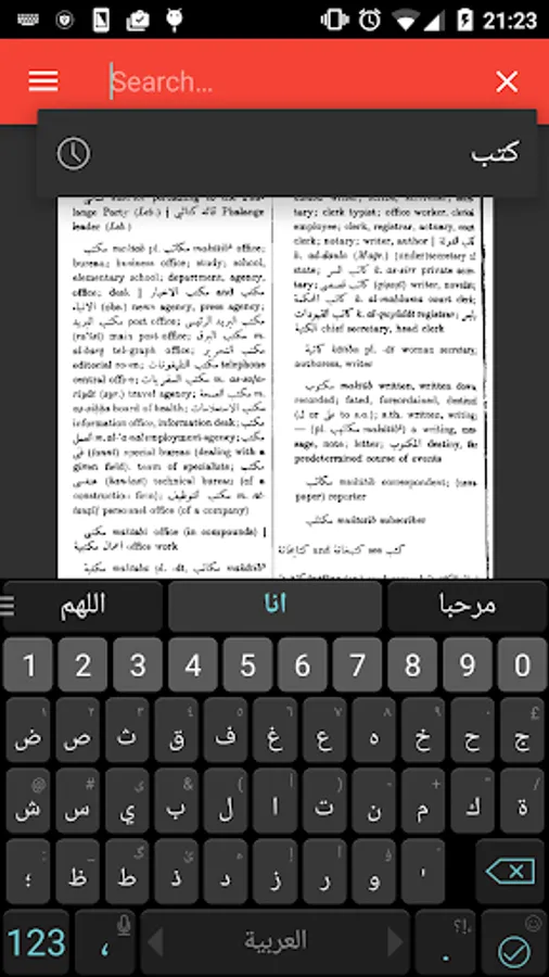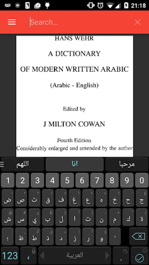 The dictionary can be searched using an Arabic keyboard, or if you do not have an Arabic keyboard the dictionary can be searched using roman (English) letters which have an Arabic equivalent. To search just simply enter the root letters of the word and click search. You can navigate through the pages of the dictionary by swiping left and right. (See the About section in the app for more details).