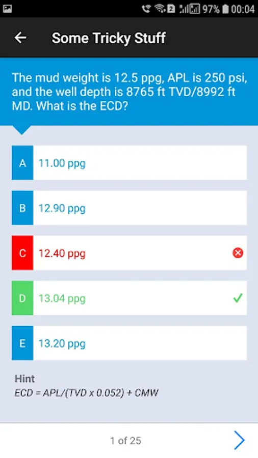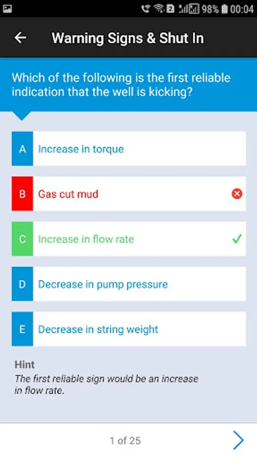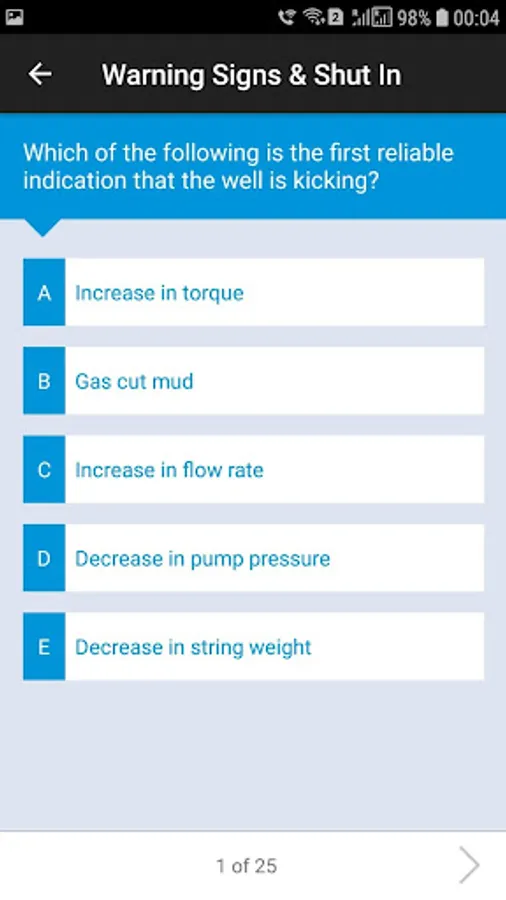 The app is simple and fast to use with multiple choice answers and useful hints. The app contains the following well control categories: