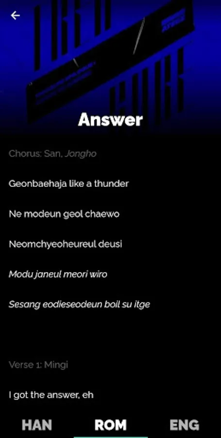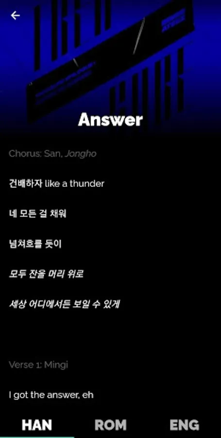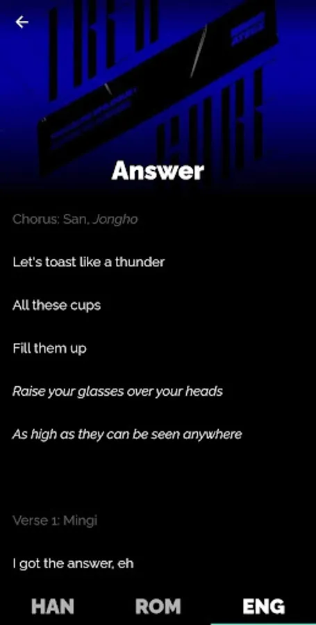 ATEEZ Lyrics is a fan-made app to read song lyrics from ATEEZ. You can switch between Hangul/Kanji, Romanized, and English. The app is completely free to use and works offline.