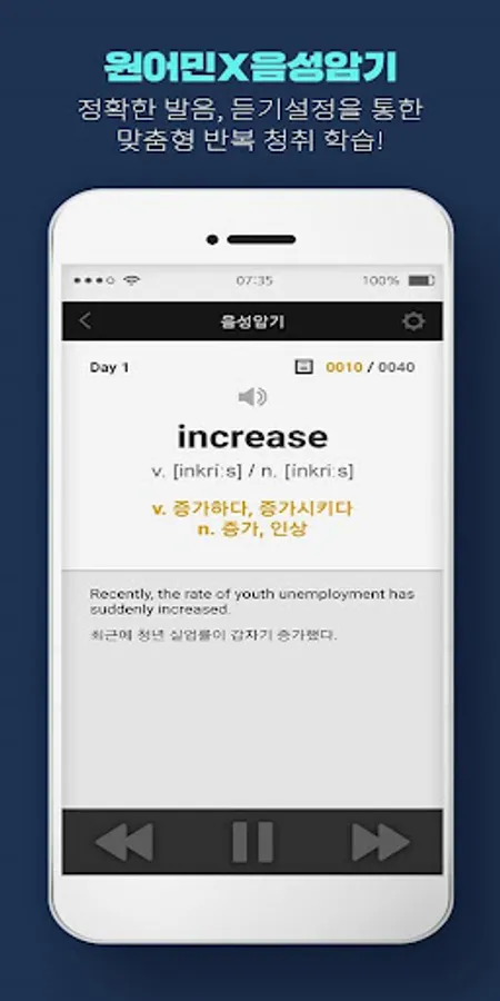 3. Voice memorization: Through the native speaker's voice for a total of 1150 words, you can listen to the correct pronunciation as well as learn and memorize repeated listening. In addition, customized listening learning is possible through listening settings.