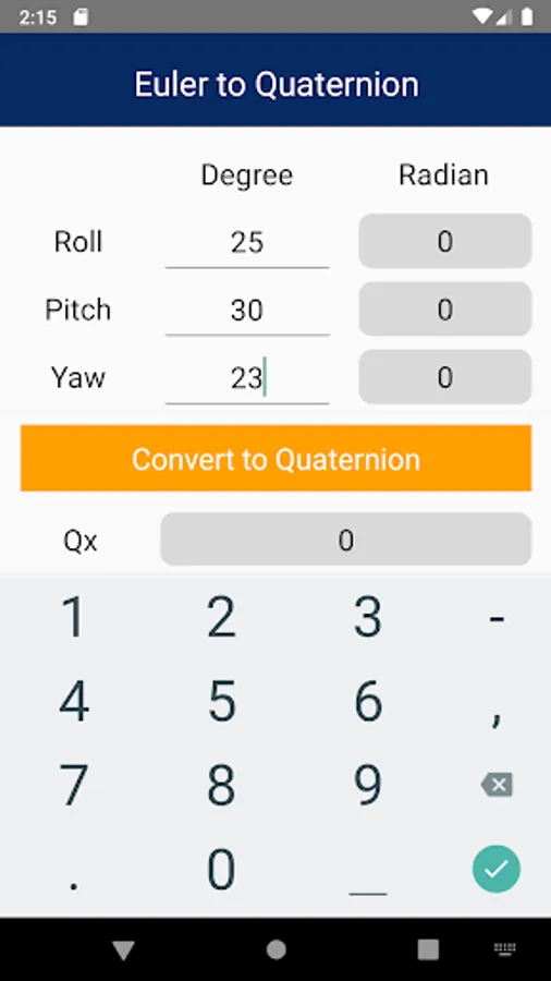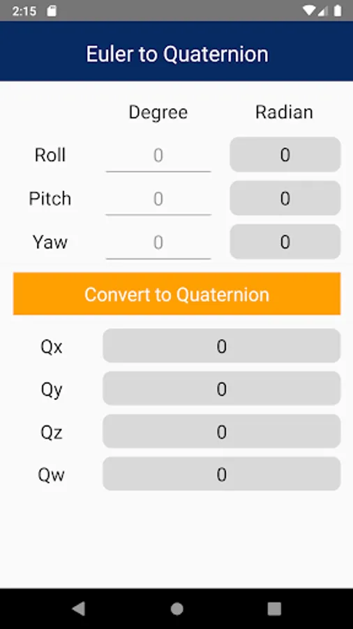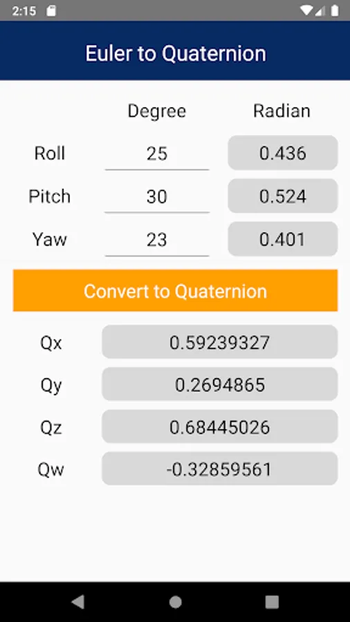 Simple calculator for Euler to Quaternion. This also can convert degree to radian. You can simply use this for unity coding, kinematics, robotics, and angle math.