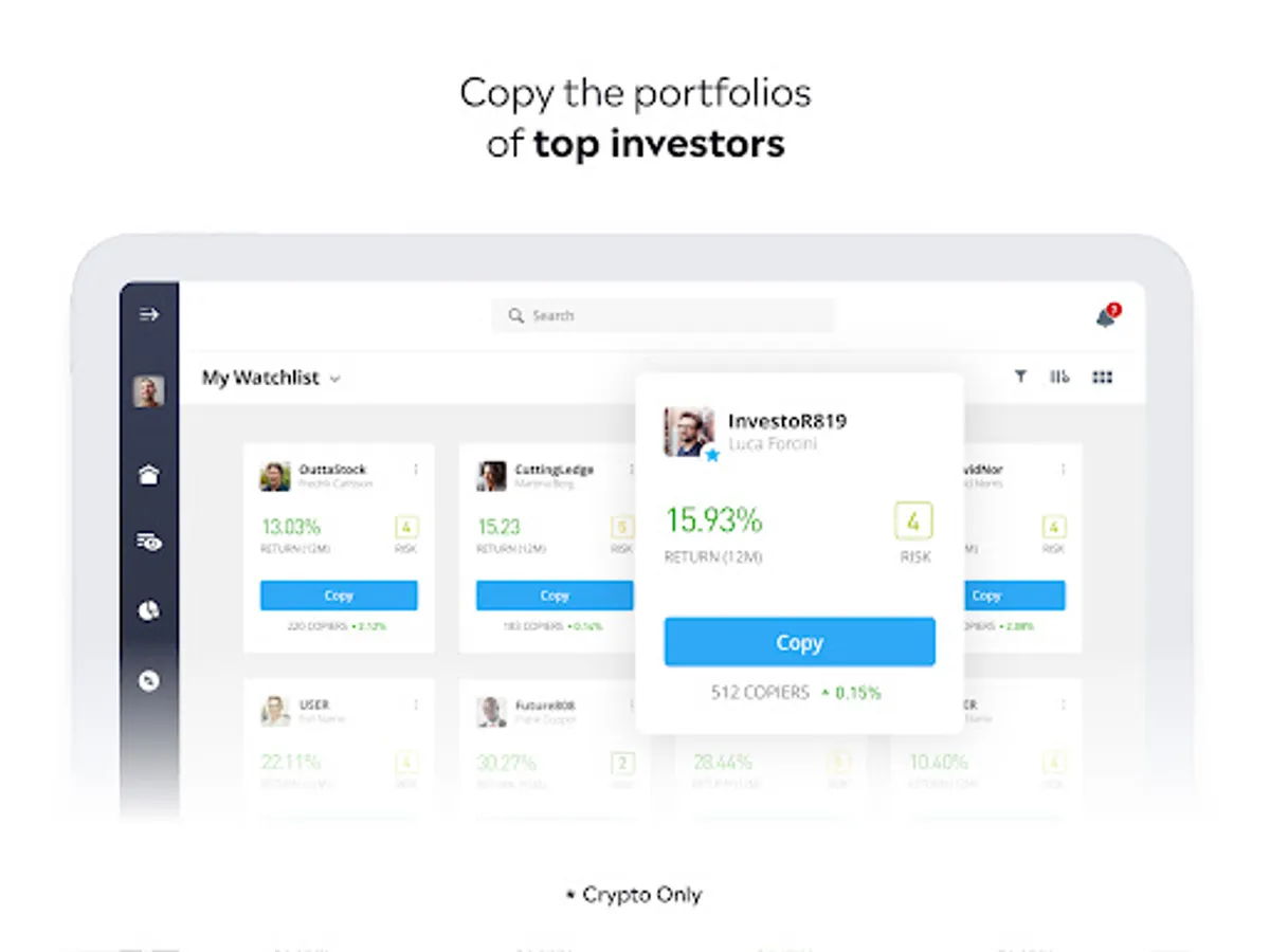 eToro is not just a place to invest online — it’s also the ideal platform to engage, connect, and share strategies with others. Our award-winning CopyTrader™ technology for trading cryptocurrencies will enable you to replicate top-performing investors’ portfolios automatically. With CopyTrader, when they trade, you trade!