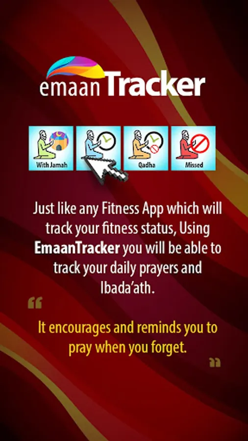 With this Mobile App, you will watch yourself about your religious duties. You will be able to tick mark what you have done and mark red what you have not. After using this application some time, you will not want to see red color in your stats. This will encourage you to pray more regularly and completely. Insha Allah
