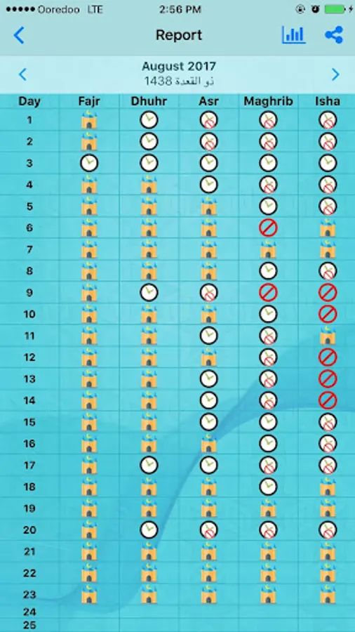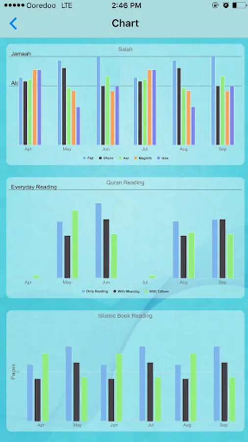 Every month you can see the development of your daily Ibada’ath with detailed reports.