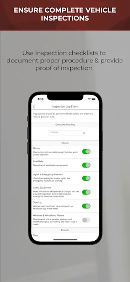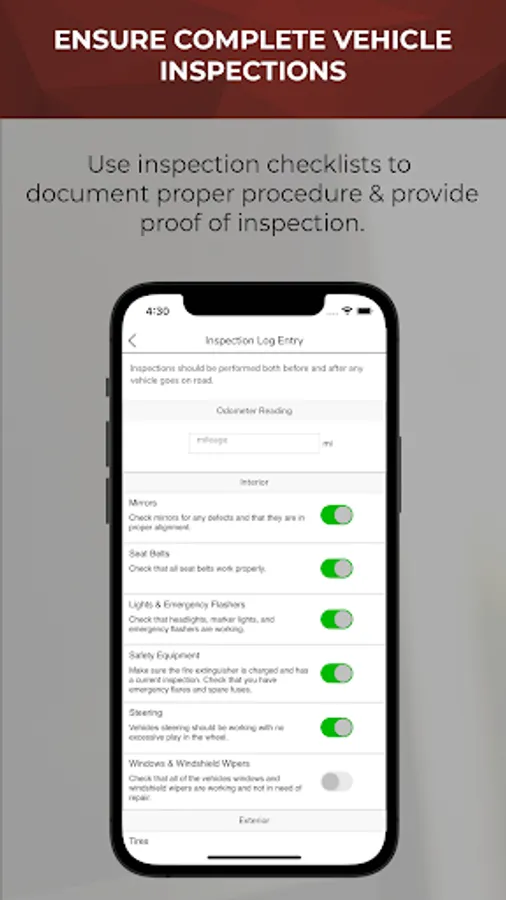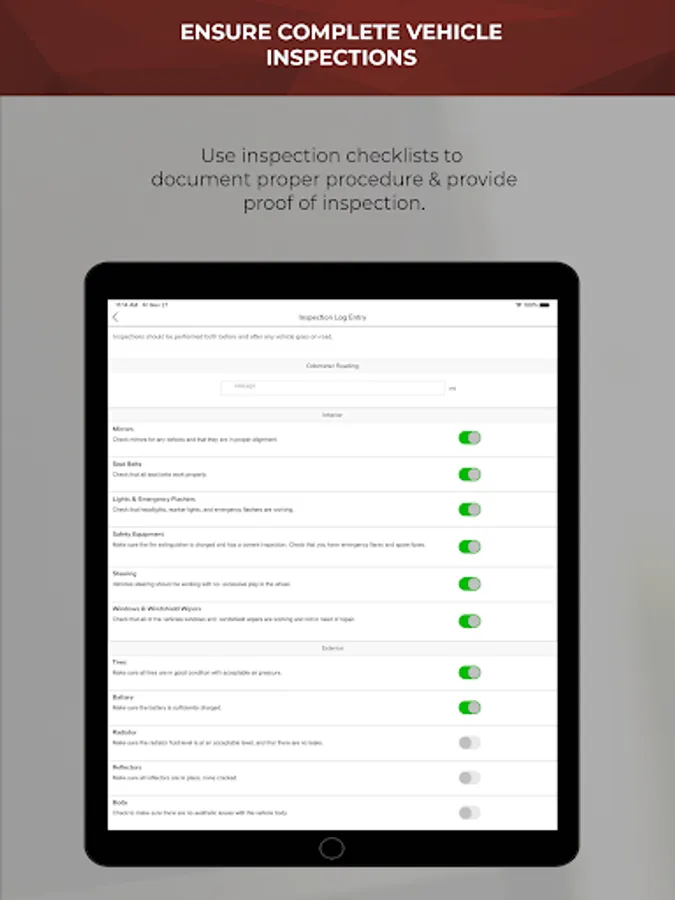 • Equipment Inspections – easily perform and document pre and post trip inspections