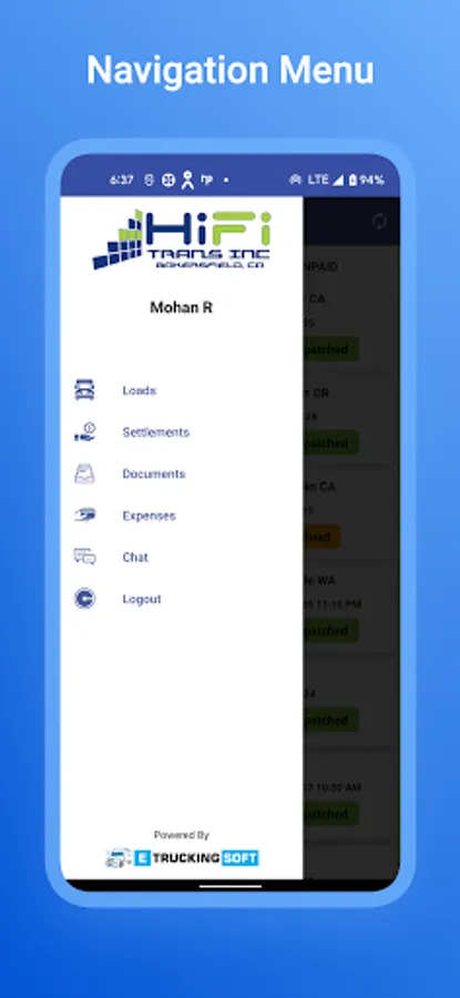 HiFi Trans app has the ability to see the driver loads, update loads status, upload documents, settlements and manage the expenses
