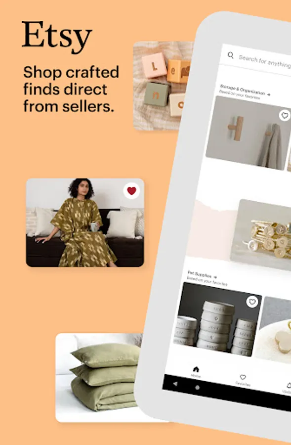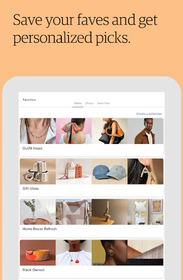When you create an account, you’ll be able to quickly save shops and items as you scroll, using the favorite button. Save each item to a general list, or build a collection of items for ongoing projects and inspiration.