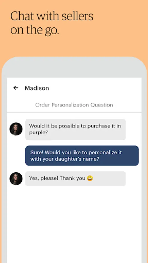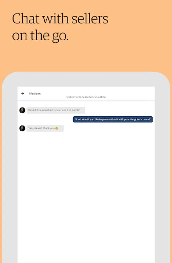 Whether you’re customizing an order, or curious about an item that you’d like to order, you can message our sellers directly in the app. Set up notifications, to ensure that you don’t miss a message!