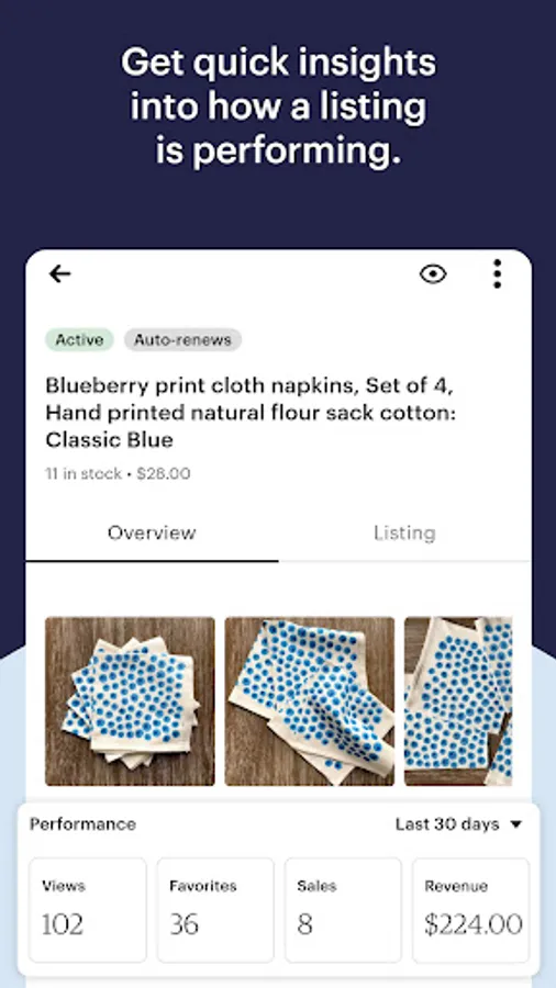 -- Get key performance stats like views, sales, and revenue in a listing overview.