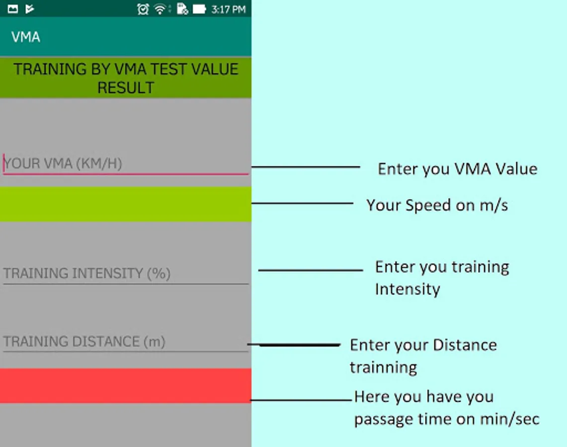 The application VMA is an application that calculates the time of passage em min / sec over the distance chosen for one or more training sessions running, based on the test of the evaluation of the maximum aerobic speed, and on the intensity of the effort and the distance.