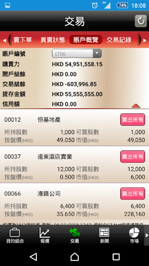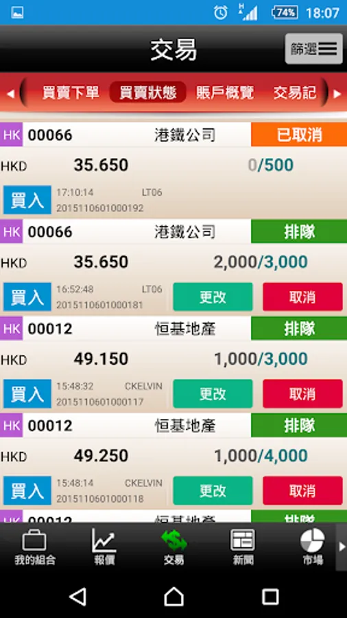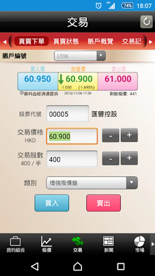「股票交易」 - 提供「賬戶概覽」、「買賣下單」、「買賣狀態」及「交易紀綠」,操作簡易。