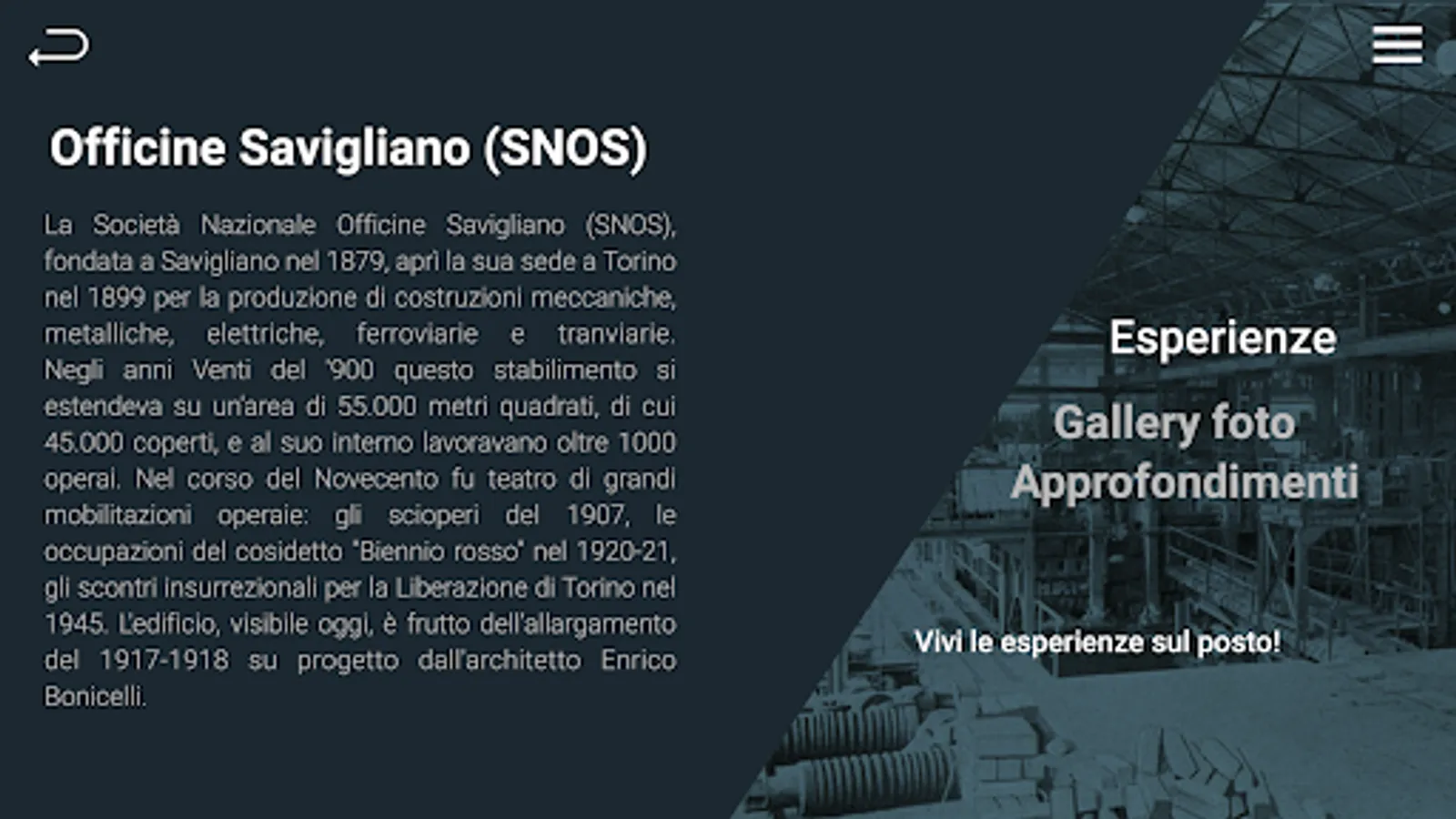 Relive the development of the former Michelin factories, the past of the Fiat Ferriere and Officine Savigliano through videos and in-depth information sheets.