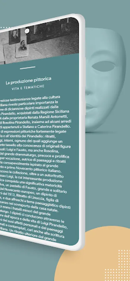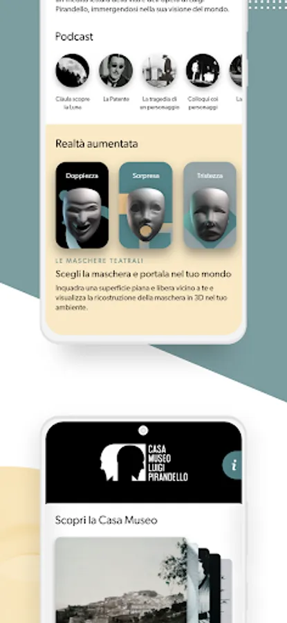 The Podcast section offers, thanks to an exceptional interpreter, the reading of some famous passages by the author taken from novels, poems and short stories. In the last section of the app, thanks to Augmented Reality, it is possible to interact with different 3D models of masks, simply through the camera of your device.