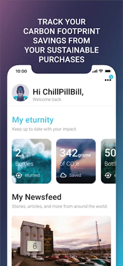 Eturnity then measures your waste and carbon footprint savings by tracking your purchases of reusable packaging for both yourself and your community. These savings are then saved in the app.